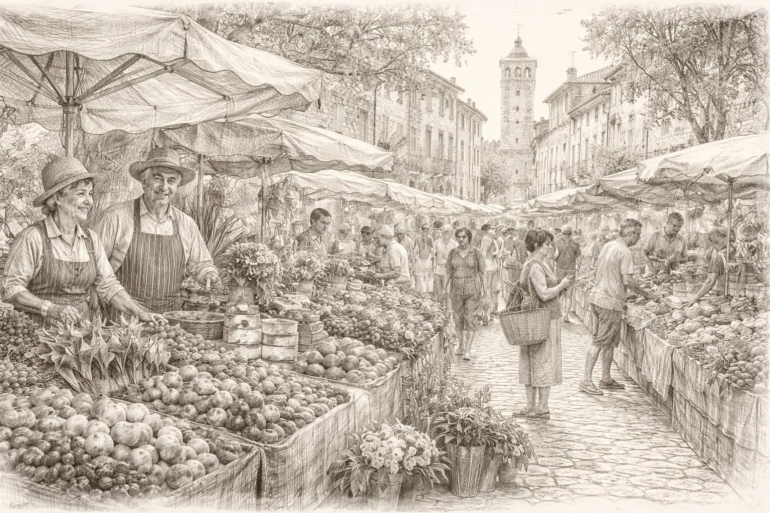 | Cadre | Marché provençal, ambiance conviviale, marché du samedi |